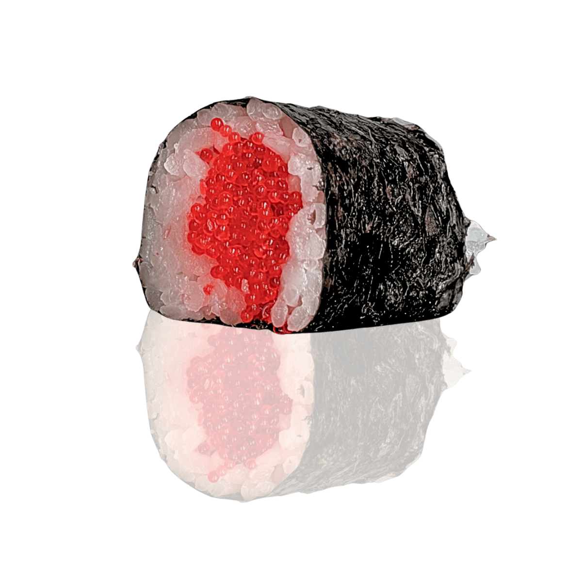 Eine Maki-Rolle mit leuchtendem Lachsrogen (Masago), der eine feine salzige Note und eine leicht knackige Textur bietet.