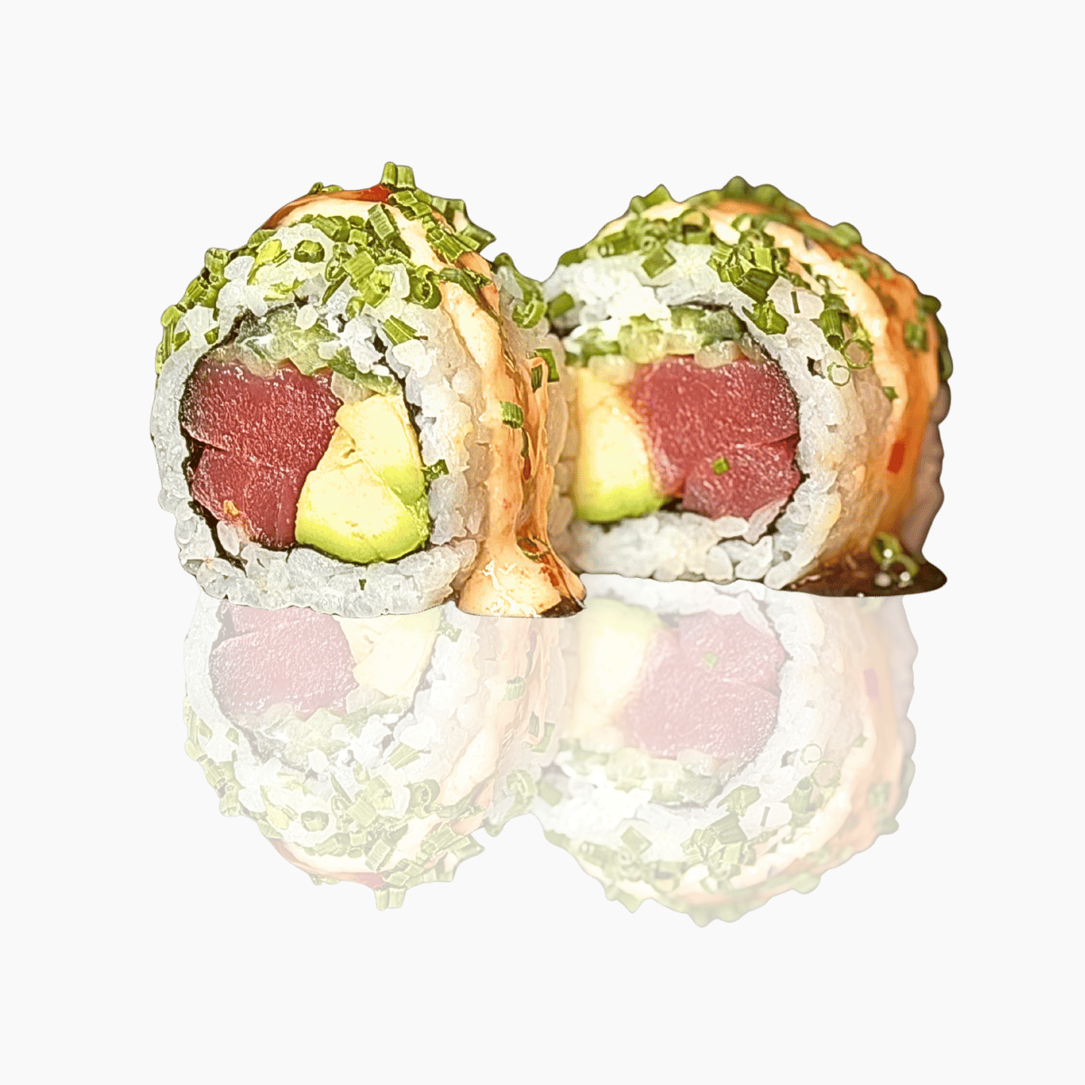 mit Thunfisch, Schnittlauch, Avocado, Gurken und Cream Cheese, darauf crushed Wasabi und Wasabisauce
