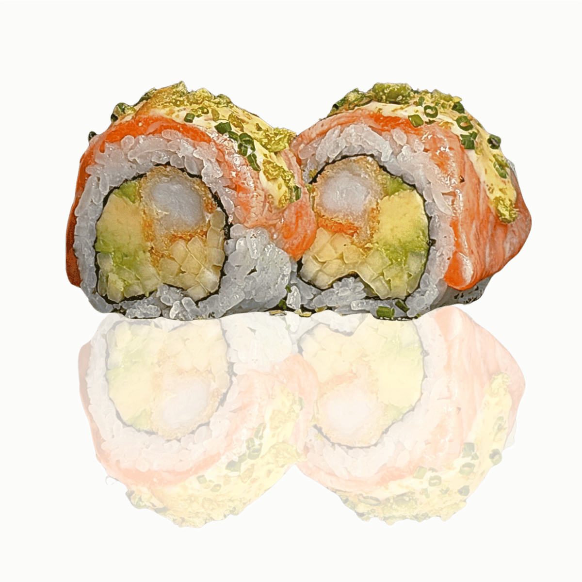 mit Mango, Avocado, Tempura Garnelen, Sesam, Cream Cheese, ummantelt mit Lachs, darauf crushed Wasabi N?sse mit Sesam-Chilisauce